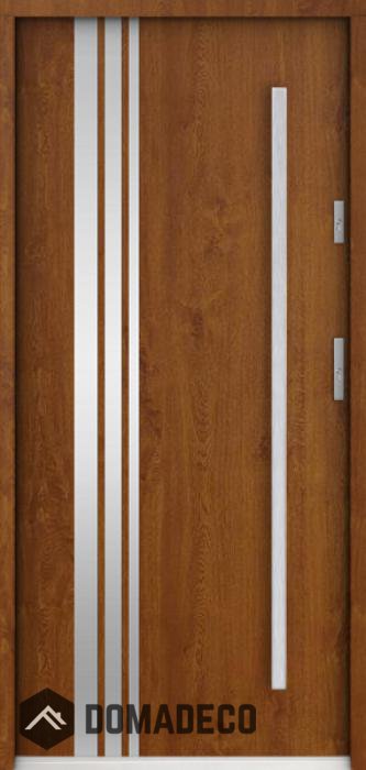 The door is made of stainless steel. Inside it is filled with PUR polyurethane foam and wood. The thickness of the door leaf is 55mm. Dual sealing system - one seal is in the dap of the frame and the other is located in the supporting part of the door leaf. They reduce vibration and protect your house from losing the heat. They don't change their volume under the influence of atmospheric conditions. The door frame has anti-burglar reinforcements in hinge parts and locking points.