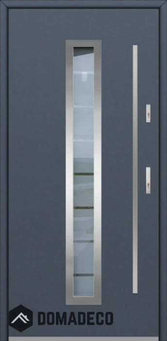 The door is made of stainless steel. Inside it is filled with PUR polyurethane foam and wood. The thickness of the door leaf is 64mm. Dual sealing system - one seal is in the dap of the frame and the other is located in the supporting part of the door leaf. They reduce vibration and protect your house from losing the heat. They don't change their volume under the influence of atmospheric conditions. The door frame has anti-burglar reinforcements in hinge parts and locking points.