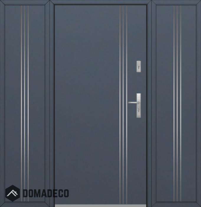 The door is made of stainless steel. Inside it is filled with PUR polyurethane foam and wood. The thickness of the door leaf is 54mm. Dual sealing system - one seal is in the dap of the frame and the other is located in the supporting part of the door leaf. They reduce vibration and protect your house from losing the heat. They don't change their volume under the influence of atmospheric conditions. The door frame has anti-burglar reinforcements in hinge parts and locking points.