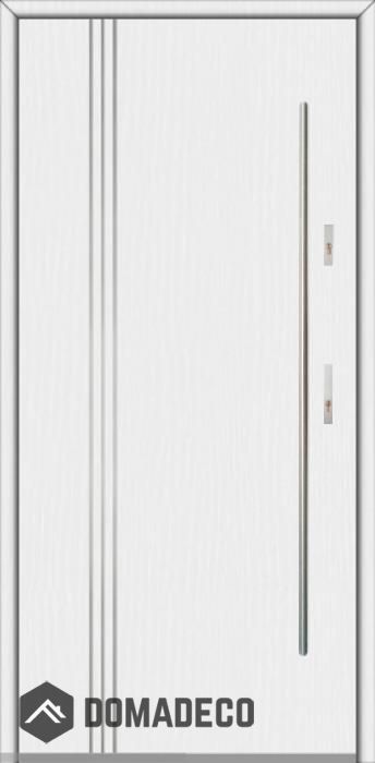 The door is made of stainless steel. Inside it is filled with PUR polyurethane foam and wood. The thickness of the door leaf is 64mm. Dual sealing system - one seal is in the dap of the frame and the other is located in the supporting part of the door leaf. They reduce vibration and protect your house from losing the heat. They don't change their volume under the influence of atmospheric conditions. The door frame has anti-burglar reinforcements in hinge parts and locking points.
