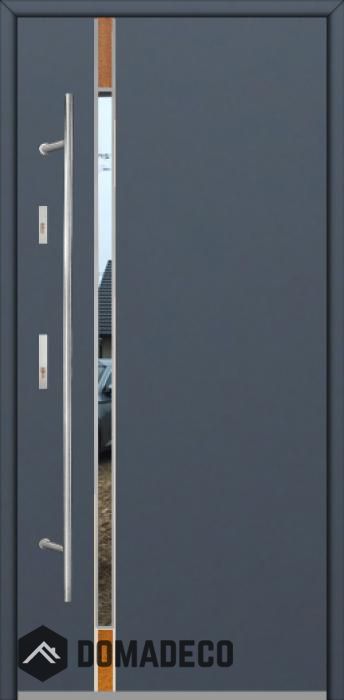 The door is made of stainless steel. Inside it is filled with PUR polyurethane foam and wood. The thickness of the door leaf is 64mm. Dual sealing system - one seal is in the dap of the frame and the other is located in the supporting part of the door leaf. They reduce vibration and protect your house from losing the heat. They don't change their volume under the influence of atmospheric conditions. The door frame has anti-burglar reinforcements in hinge parts and locking points.