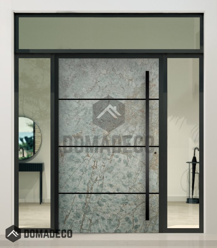Aluminium LIM hinged front door with left, right and top glass panel