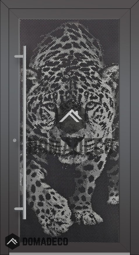 LIM G5 - Glass entry aluminium door with with tiger motif in decorative panel