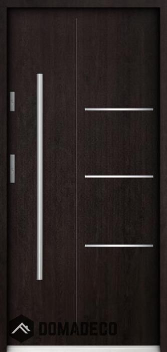 The door is made of stainless steel. Inside it is filled with PUR polyurethane foam and wood. The thickness of the door leaf is 55mm. Dual sealing system - one seal is in the dap of the frame and the other is located in the supporting part of the door leaf. They reduce vibration and protect your house from losing the heat. They don't change their volume under the influence of atmospheric conditions. The door frame has anti-burglar reinforcements in hinge parts and locking points.