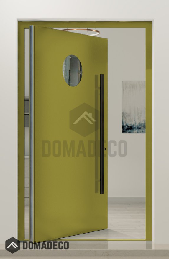 PIVOT Bila - exterior aluminium pivot door with circular glass