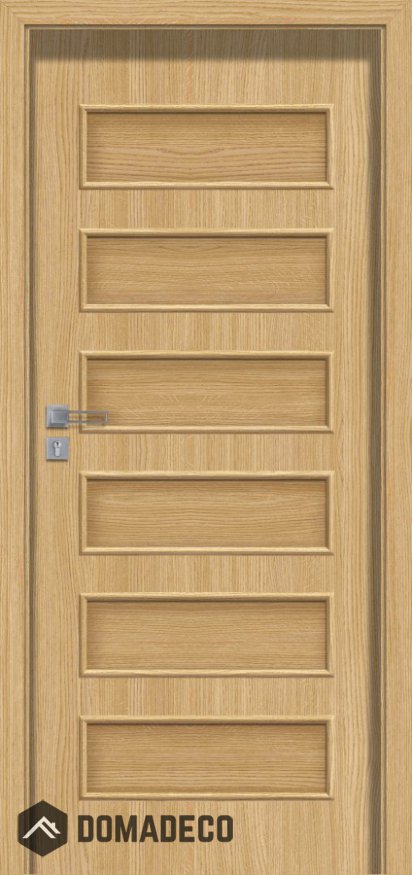 The door is made of a wooden rail and stail set topped with two flush HDF boards, covered with ECO TOP, HIGH TOP surface. The core is made of honeycomb-like stabilizing layer.