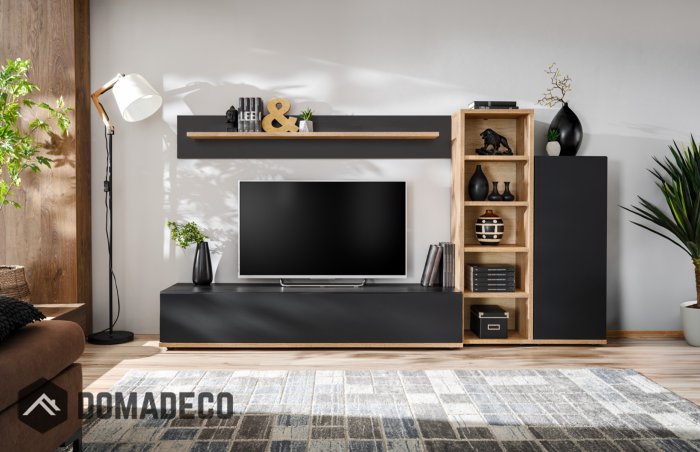 Practical storage solutions - closed cabinets, open shelves and a spacious TV compartment will accommodate all the necessary items and decorations.