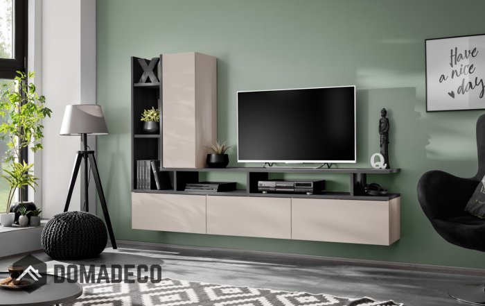 Layout: tall cabinet with shelves, open shelves, TV cabinet with drop-down fronts