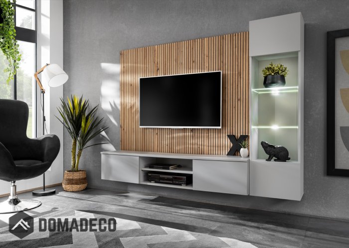 Wall panel with printed black stripes and a TV opening.